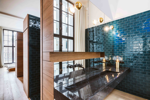 Der Fußboden aus tabakgeräuchertem Eichenparkett bildet das verbindende Element der verschiedenen Raumsequenzen, verleiht Wärme und Haptik. Glacierte türkisblaue Fliesen spiegeln den New Yorker Loft-Style wieder, der noch durch die Sammlerstücke wie die Sofalandschaft der Schweizer Manufaktur De Sede, sowie die Melt-Stand Lampe von Tom Dixon verstärkt wird.