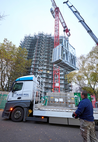 Die Fensterelemente werden angeliefert: Das Hochhaus an der Abendrothstraße in Köln-Seeberg wurde umfassend energetisch saniert