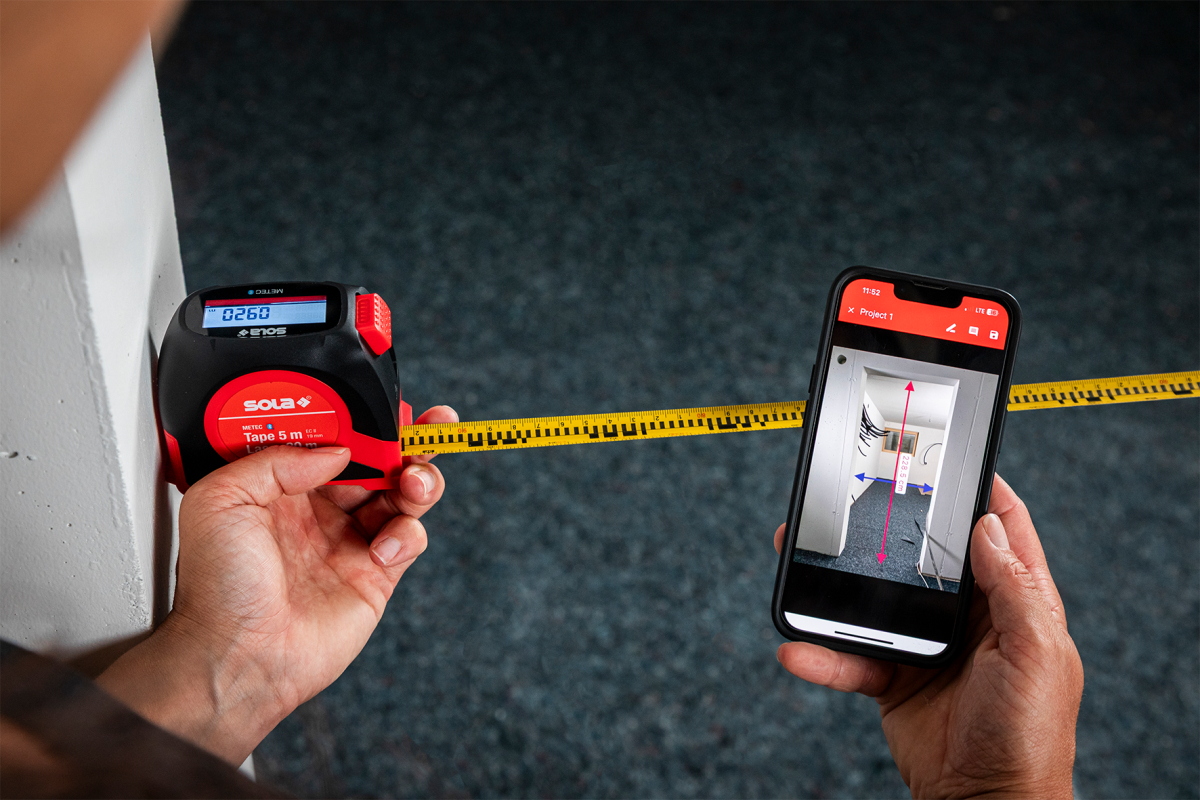 Mit dem „Metec“ bietet Sola ein kombiniertes Messgerät aus digitalem 5-Meter-Rollbandmaß und Laser-Entfernungsmesser. Das Gerät ermöglicht präzise Längen-, Flächen- und Volumenmessungen sowie die kabellose Datenübertragung per Bluetooth an die Sola-Measures-App oder den Sola-Data Connector. Mit der App lassen sich Messwerte direkt in Fotos einfügen. Alle Daten können gespeichert, weiterverarbeitet oder geteilt werden. Das Rollbandmaß zeigt Messwerte mit einer Genauigkeit von ±1,5 mm auf einem beleuchteten LCD-Display an und verfügt über eine permanente Bandbremse sowie wählbare Messeinheiten und Bezugspunkte. Der Laser misst Entfernungen bis 20 m mit einer Genauigkeit von ±2,0 mm und bietet zusätzliche Funktionen wie Flächen-, Volumen- und indirekte Pythagoras-Messungen. Bis zu 50 Messwerte können im Speicher abgelegt werden. Das Gerät ist ergonomisch geformt, stoßgeschützt und nach IP54 gegen Staub und Spritzwasser geschützt. Es wird mit zwei AAA-Batterien betrieben und erreicht eine Betriebsdauer von bis zu sechs Stunden.