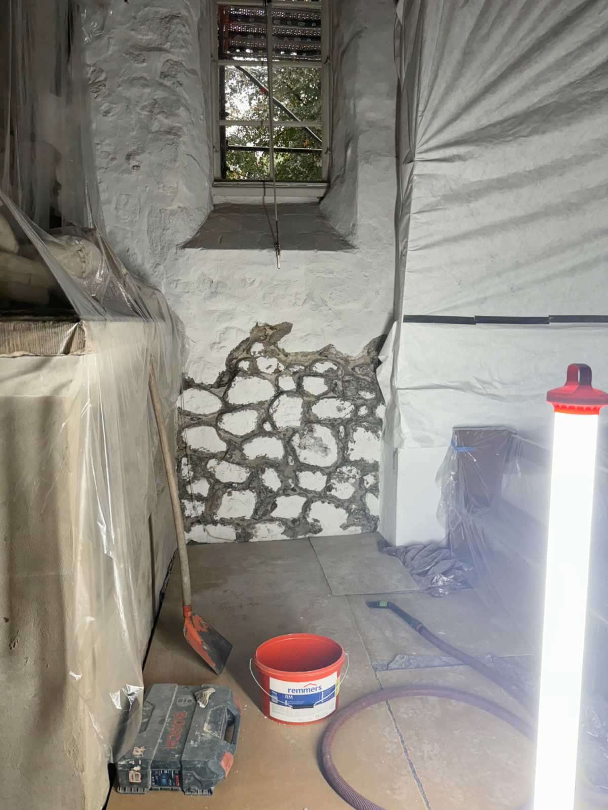 Unerlässlich war die Bestimmung historischer und mit dem Bestand verträglicher Materialien – insbesondere der gipshaltigen Mauer- und Muschelkalkmörtel – unter Abstimmung der Planungsbeteiligten sowie die Abwägung der restauratorischen Anforderungen und durch den Bestand bedingten baulichen Situationen.