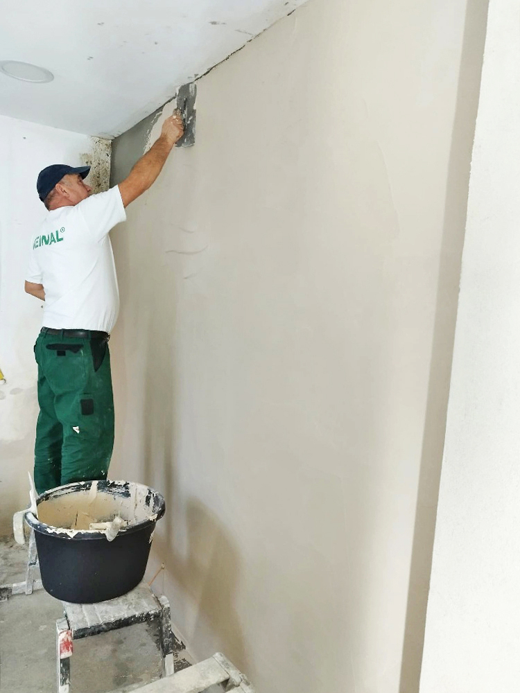 Zusätzlich führten die Handwerkerinnen und Handwerker weitere Abdichtungs- und Putzarbeiten im Bereich des Wand-Bodenabschlusses aus: Horizontalsperre, Sperrputz, Hohlkehle gegen eindringendes Flüssigwasser sowie Abdichtung mit polymerer Harzabdichtung. Es kam außerdem Sanierputz von Veinal zum Einsatz.