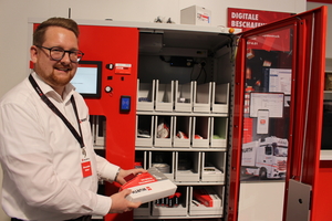 Ihr Portfolio an Schutzbrillen, Handschuhen, Masken, Werkzeugen und digitalen Tools hatte Würth mit nach Köln gebracht. Auf Interesse stieß der Automat „Orsy mat WGT“. Diesen Schrank kann der Kunde individuell befüllen mit Artikeln des täglichen Gebrauchs, wie Zollstöcke, Handschuhe und Feuerzeuge. Per Wiegetechnik erkennt der Automat, welche Artikel entnommen worden sind und bestellt diese nach. „Jeder Betrieb hat die volle Bestandsübersicht. Die lästige Kontrolle der Artikel entfällt“, sagte Würth-Verkäufer Alexander Göbel.