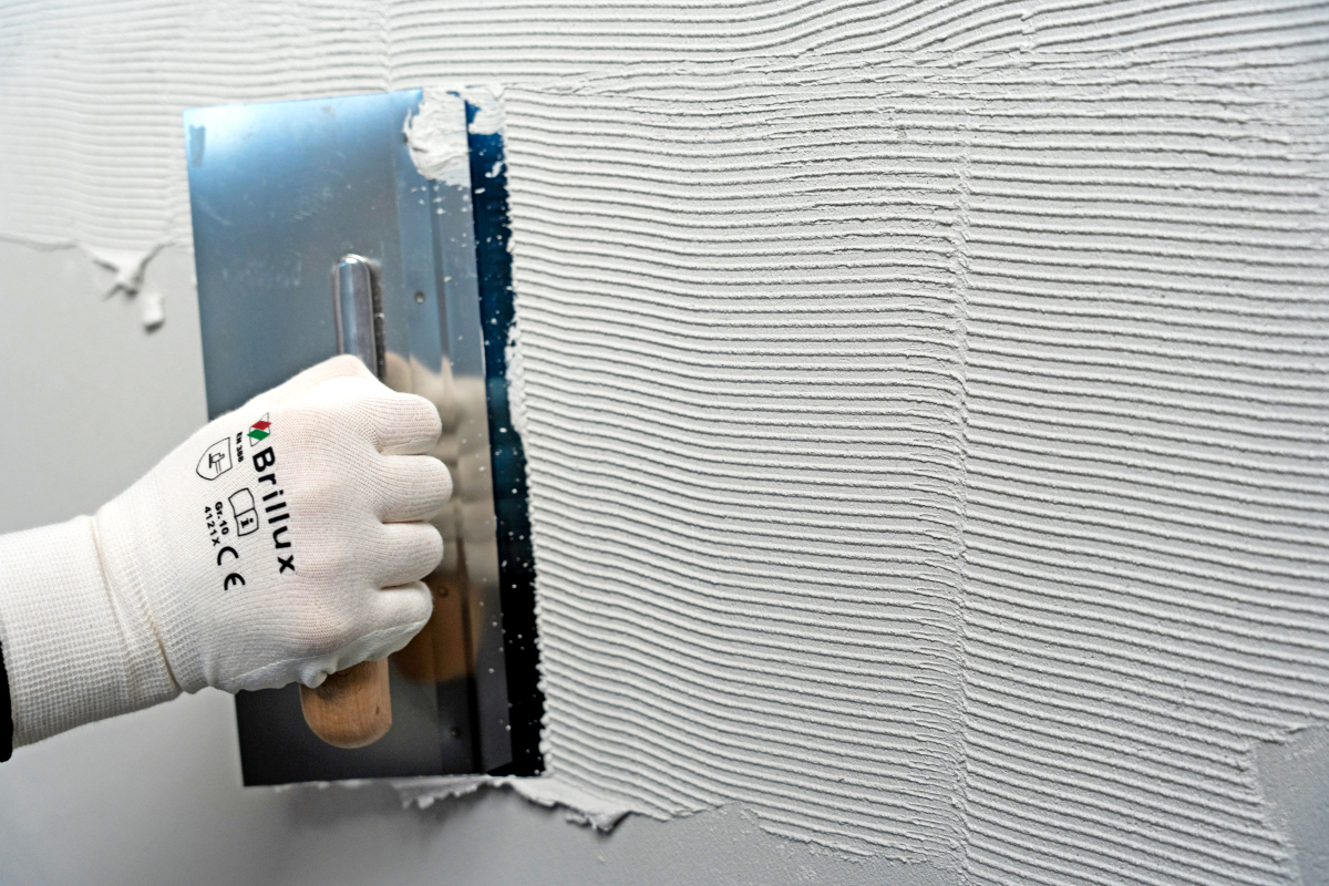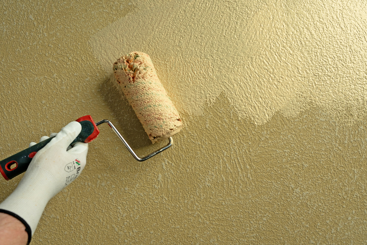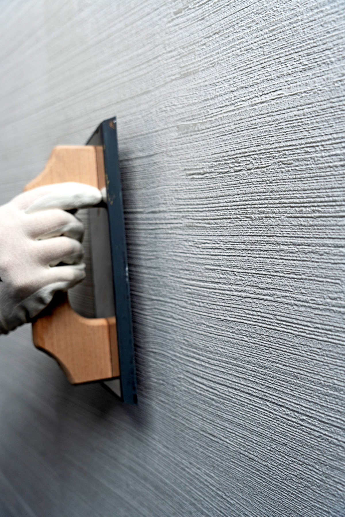 Nach dem Spachtelauftrag und dem Glätten bilden Handwerkerinnen und Handwerker die Struktur mit der „Schaumstoff-Strukturwalze 1104“ aus. Dabei heben sie abwechselnd die Rolle an den Rändern links und rechts an und unterbrechen dabei das vollständige Abrollen. So bleibt nur auf einem Teilbereich der abgerollten Fläche die grobe Rollenstruktur erhalten. Mit der „Venezianischen Glättekelle 1764“ wird die Rollenstruktur danach leicht geglättet.