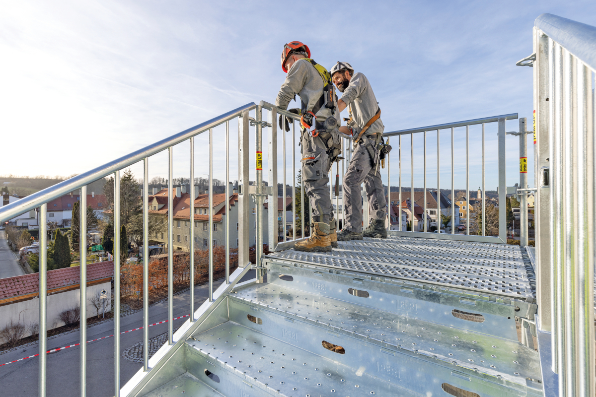 Die öffentliche Treppe wird – analog zum Gerüstbaukasten – nahezu kupplungsfrei montiert. Obwohl sie auf hohe Traglasten von bis zu 7,5 kN/m² ausgelegt ist, sind die Systembauteile handlich und sehr leicht: So lässt sich die Treppe schnell und unkompliziert errichten, indem die ineinandergreifenden Treppenstufen zügig von unten nach oben eingelegt werden. Zusätzliches Werkzeug braucht es dabei nicht. Dadurch kann man auch kurzfristig auf bauseitige Veränderungen reagieren.