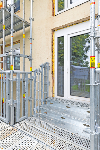 Baustellen im öffentlichen Raum stellen stets eine besondere Herausforderung dar. Hier gilt es nicht nur, eine zuverlässige Gerüst- und Zutrittslösung für das Montageteam zu schaffen – vor allem auch der sichere Publikumsverkehr muss gewährleistet werden. Häufig passieren täglich dutzende von Passanten die Baustelle. Bei umfassenden Sanierungsarbeiten an Mehrfamilienhäusern beispielsweise benötigen die Bewohnerinnen und Bewohner einen Zugang zu den verschiedenen Ebenen des Gebäudes.