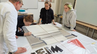 Das Team aus vier Schülern setzt die vier gemalten Teile der Rekonstruktion zusammen
