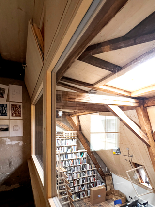 Eine Etage darüber, im ersten Dachgeschoss, beginnen hinter einer Holzglaswand dann die eigentlichen Räumlichkeiten des Architekturbüros. Alle Oberflächen wurden dort in ihrem vorgefundenen Zustand belassen, um die Spuren der Zeit zu erhalten. Dies erzeugt zusammen mit den wertigen, aber roh belassenen hinzugefügten Bauteilen eine lebhafte Buntheit. Die Räume strahlen einen beinahe industriellen Charakter aus, den man von außen gar nicht erwartet.