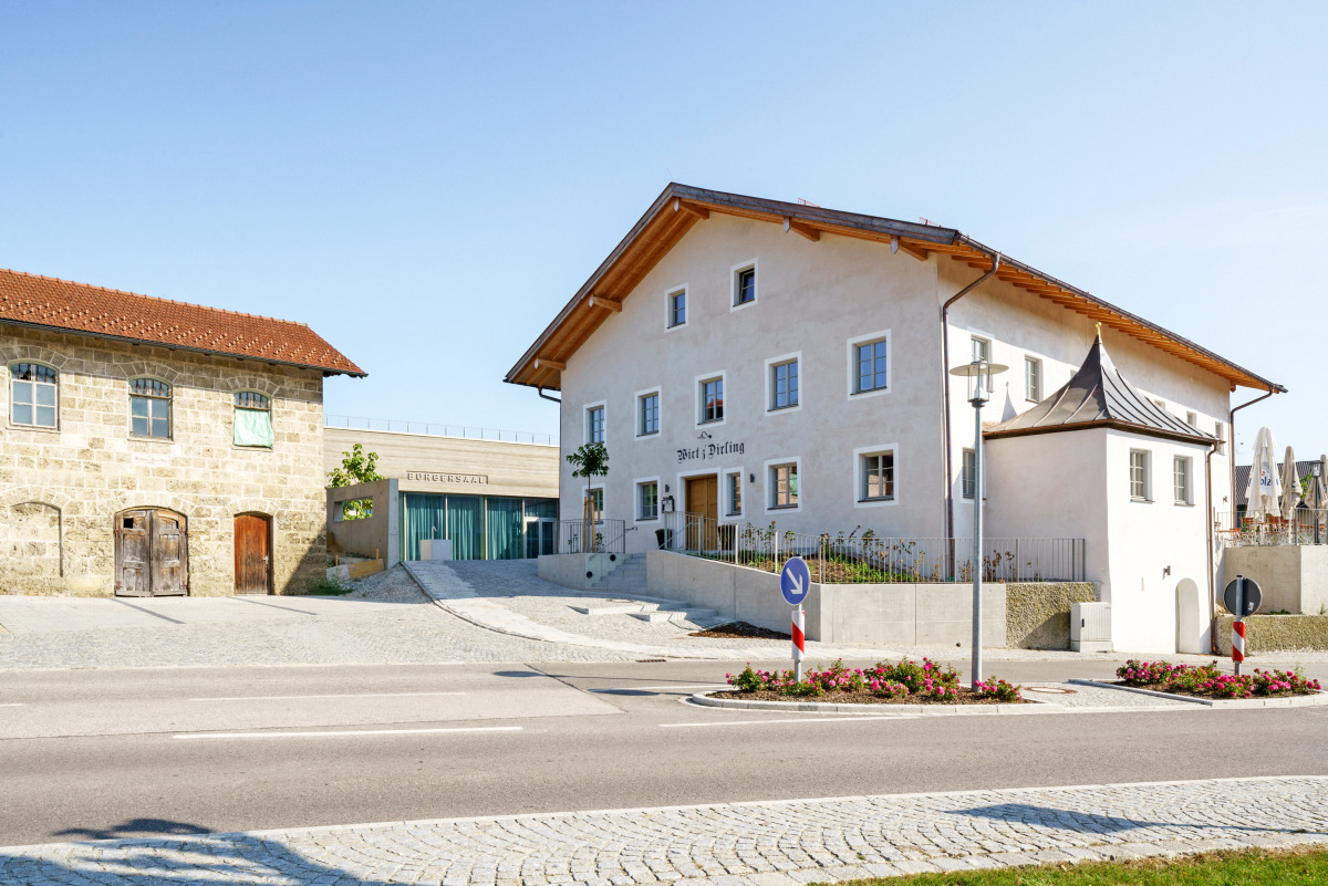 Kommunikation und Engagement sind vielleicht die beiden Schlüsselwörter, wenn es um die Sanierung und Erweiterung des Gasthofes im ostbayerischen Tyrlaching geht. Der dortige Bürgermeister Andreas Zepper hatte die Idee eines Ortes der Begegnung für alle Lebensphasen und gleichzeitig den Wunsch, diesen funktional und ästhetisch aufzuwerten. Mit großem Enthusiasmus und der Einbindung der Gemeinde in die Idee und die Umsetzung, ist es ihm gelungen, das Projekt voranzutreiben und zu einem äußerst gelungenen Abschluss zu bringen. Die architektonische Umsetzung erfolgte durch das Büro H2M Architekten, die 2016 über ein VOF-Verfahren (Vergabeverordnung für freiberufliche Leistungen, bis 2016 Vergabe für öffentliche Auftraggeber) für öffentliche Bauten, an das Projekt gekommen waren. Auch das kleinere Kellerhaus mit einem 25 m in den Berg ragenden Kellerraum, für das das Architekturbüro ebenfalls die Eingabeplanung machte, wurde inzwischen saniert.