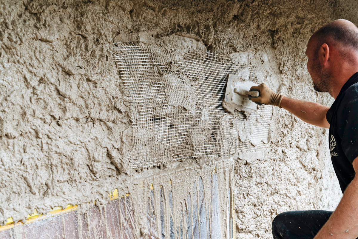 Der Reinkalkputz „RKP 04“ wird mit einem Armierungsgewebe zur Rissüberbrückung an der Fassade aufgebracht