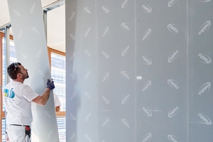 Die Trennwand „RigiMove“ lässt sich immer wieder auf- und abbauen. Dabei muss weder geschraubt und gespachtelt noch geschliffen werden, wodurch die sonst üblichen Trocknungszeiten entfallen. Damit eignet sie sich für temporäre oder dauerhaft modulare Raumsysteme, etwa in Büros, Ausstellungsräumen oder bei Umbauten. Als Grundgerüst dienen teleskopierbare I- und C-Modulprofile. Die ausfahrbaren Kopf- und Fußteile sorgen für eine präzise Ausrichtung und Stabilität. Die Profile werden zwischen Boden und Decke gespannt und lassen sich über integrierte Schnellspanner fixieren. Die „RigiMove“- Systemplatten verfügen über ein Nut- und Federsystem an ihren Längskanten. Darüber werden die Platten fest miteinander verbunden. Ganz ohne Fugenverspachtelung entsteht auf diese Weise eine glatte Oberfläche, die den Untergrund für hochwertige Beschichtungen bildet. Zur Befestigung der Systemplatten sind die vertikalen Ständer mit einem Modulklettband (Hakenband) ausgestattet. Die Platten selbst verfügen rückseitig über ein Plattenklettband (Flauschband) und lassen sich so einfach und schnell montieren und später wieder abbauen. Gedämmt wird das System mit der für Innenräume entwickelten Trennwandplatte „Akustic TP 1 Lanaé“ von Isover.