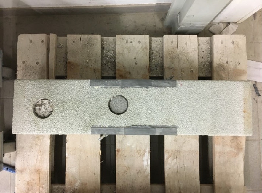 Nach Applikation der „Triflex ProPark“-Aufbauten, bestehend aus Triflex „Pox Primer 116+“ als Sperr- sowie Haftgrundierung, der vliesarmierten „Triflex ProPark“- Abdichtungsebene und den verschiedenen Aufbauvarianten 1 bis 3, wurde in den Prüfkörpern ein definierter mittiger Biegeriss erzeugt. Die Druckwasserbeanspruchung erfolgte über seitlich angeordnete Bohrpacker, die den Riss gezielt kreuzten. Der Wasserdruck wurde stufenweise von zunächst 100 kPa auf bis zu 200 kPa (entspricht 20 m Wassersäule) erhöht. Parallel dazu wurde die Rissbreite schrittweise von 0,10 mm in 0,05-mm-Schritten bis auf ein maximales Kriterium von 0,60 mm eingestellt. Die Gesamtdauer der Prüfung betrug 210 Tage unter konstanten Laborbedingungen (20 °C, 50–65 % relative Feuchte).
