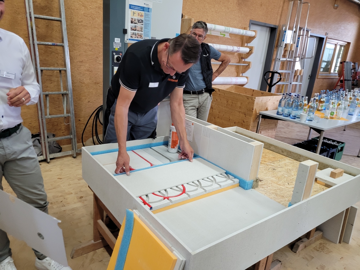 Im Praxisteil wurden Anschlussmöglichkeiten für vorgefertigte Fassadenelemente auf der Baustelle gezeigt, Trockenbodenaufbauten mit Fußbodenheizungen und Details im Türdurchgang sowie das richtige Messen von Schadstoffen auf der Baustelle.