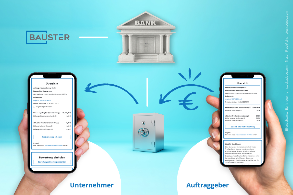 Bauster sichere die Aufträge ganz einfach ab, indem die vereinbarte Auftragssumme vorab auf einem insolvenzsicheren Treuhandkonto beim Partner Mangopay hinterlegt wird. Mangopay hat sich seit Jahren auf dem Portal „Vinted“ – ehemals Kleiderkreisel – bewährt und sorgt für eine sichere und reibungslose Kaufabwicklung zwischen einander unbekannten Personen. Je nach gewähltem Tarif kostet der Treuhandservice für Auftragnehmer maximal zwei Prozent der hinterlegten Auftragssumme oder eine Monatsgebühr.