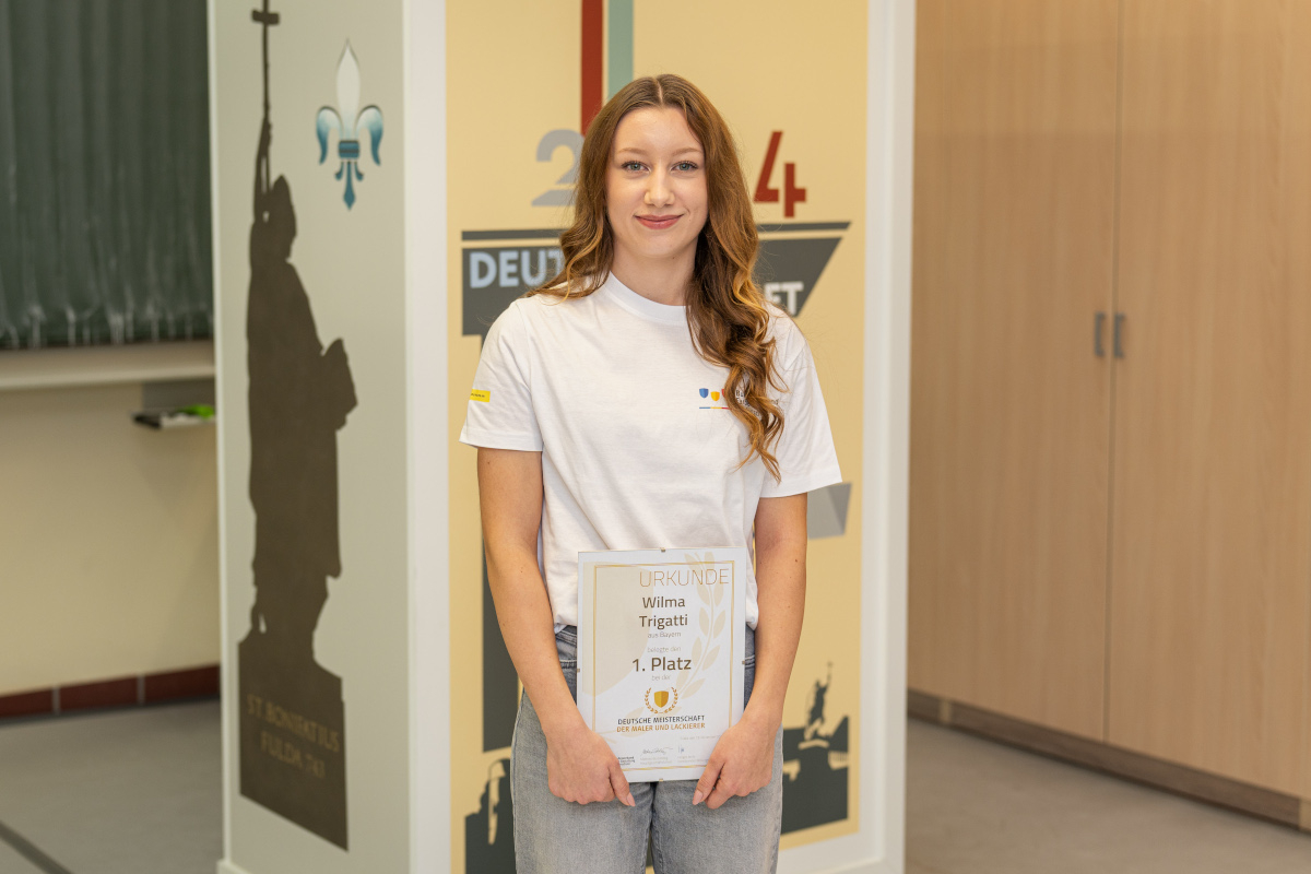 15.11.2024Vom 11. bis 13. November fand die Deutsche Meisterschaft der Maler und Lackierer in der Ferdinand-Braun-Schule in Fulda statt. An zwei Wettbewerbstagen wetteiferten 16 junge Malerinnen und Maler um den Titel „Deutscher Meister der Maler und Lackierer 2024“. Nun steht fest: Die 20-jährige Wilma Trigatti aus Essfeld in Bayern darf sich ab sofort beste Malerin Deutschlands nennen. Der zweite Platz ging an Jan Engels aus Nordrhein-Westfalen. Die Bronzemedaille gewann Tim Schäfer aus Hessen.
